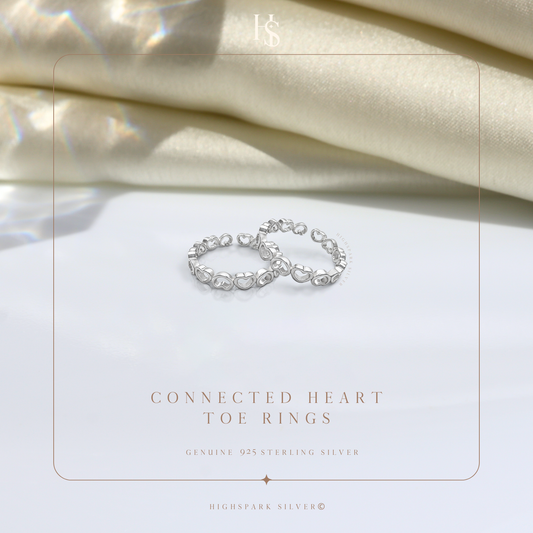 Connected Heart Toe Rings - Adjustable in 925 Sterling Silver - 2 Piece