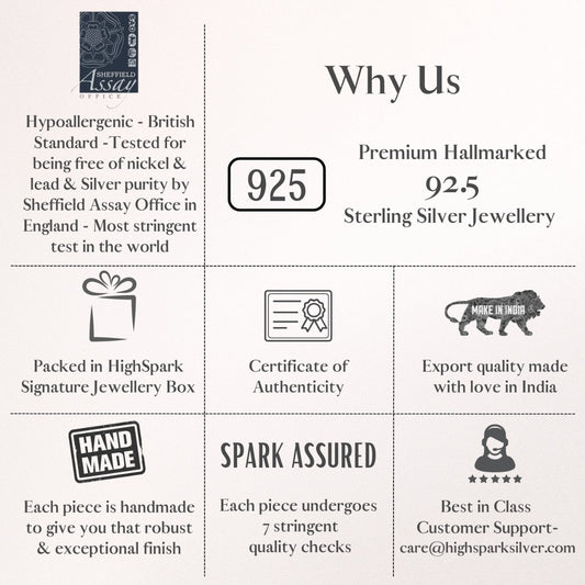 Genuine Hallmarked Sparkling 92.5 Sterling Silver is the heart of our brand. All our jewellery is 100% Hypoallergenic - Nickel, Lead & Cadmium Free! We understand the taste, choices & concerns of our online customers. We assure you of a pure & delightful experience of online silver jewellery shopping.