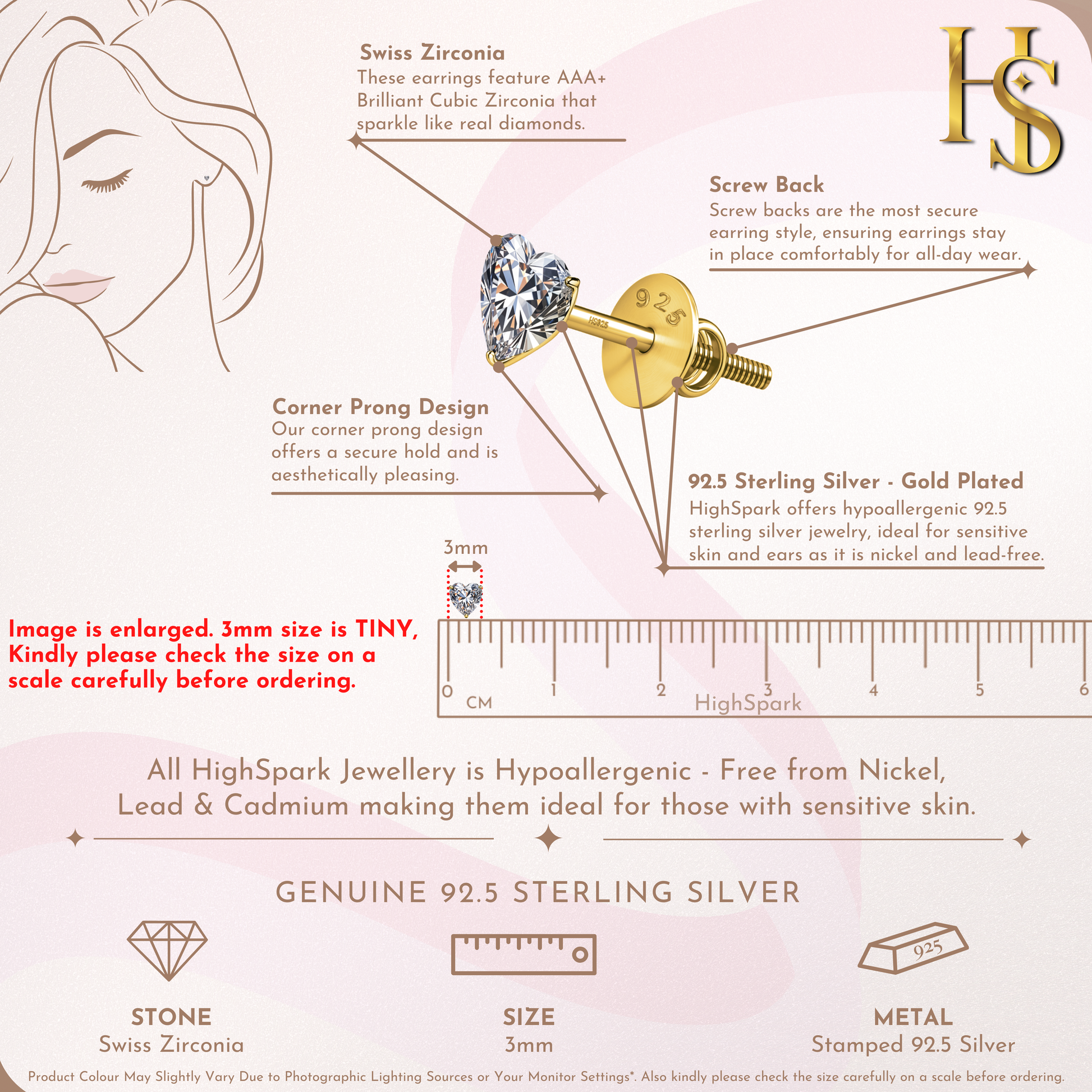 Adorable Heart Solitaire Screwback Studs Earrings in 925 Sterling Silver With 18k Gold Finish