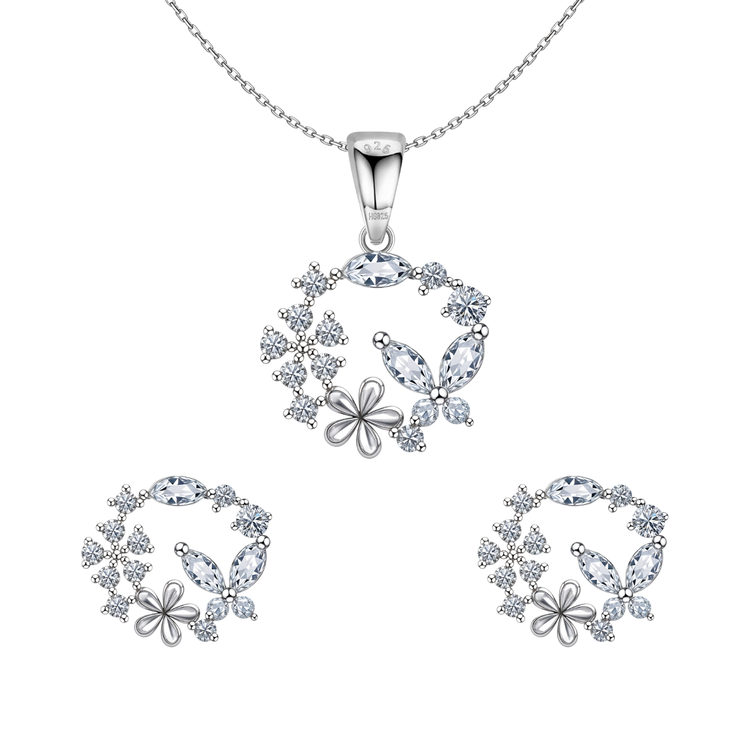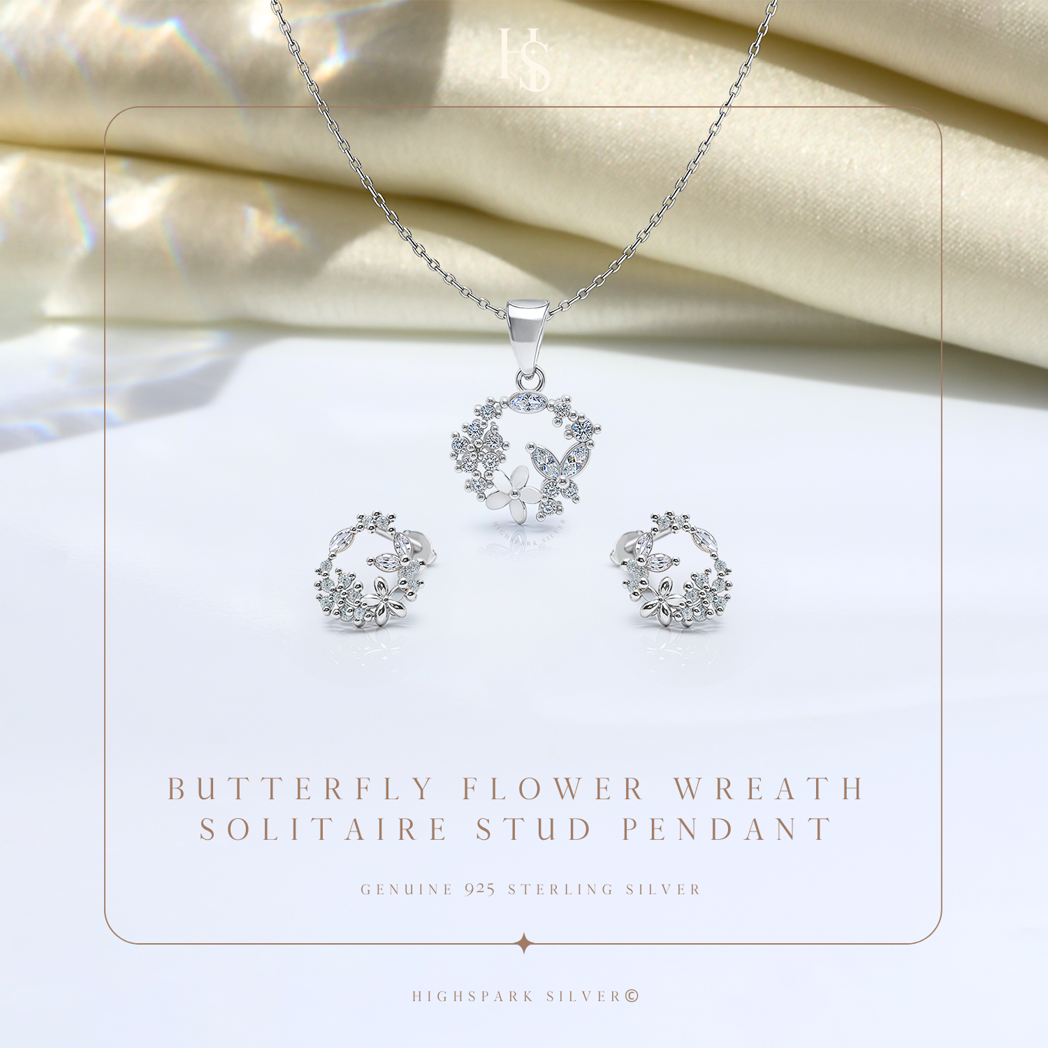 Butterfly Flower Wreath Solitaire Earrings, Pendant & Chain Set in 92.5 Sterling Silver With Diamond like Brilliance Sparkling Zirconia
