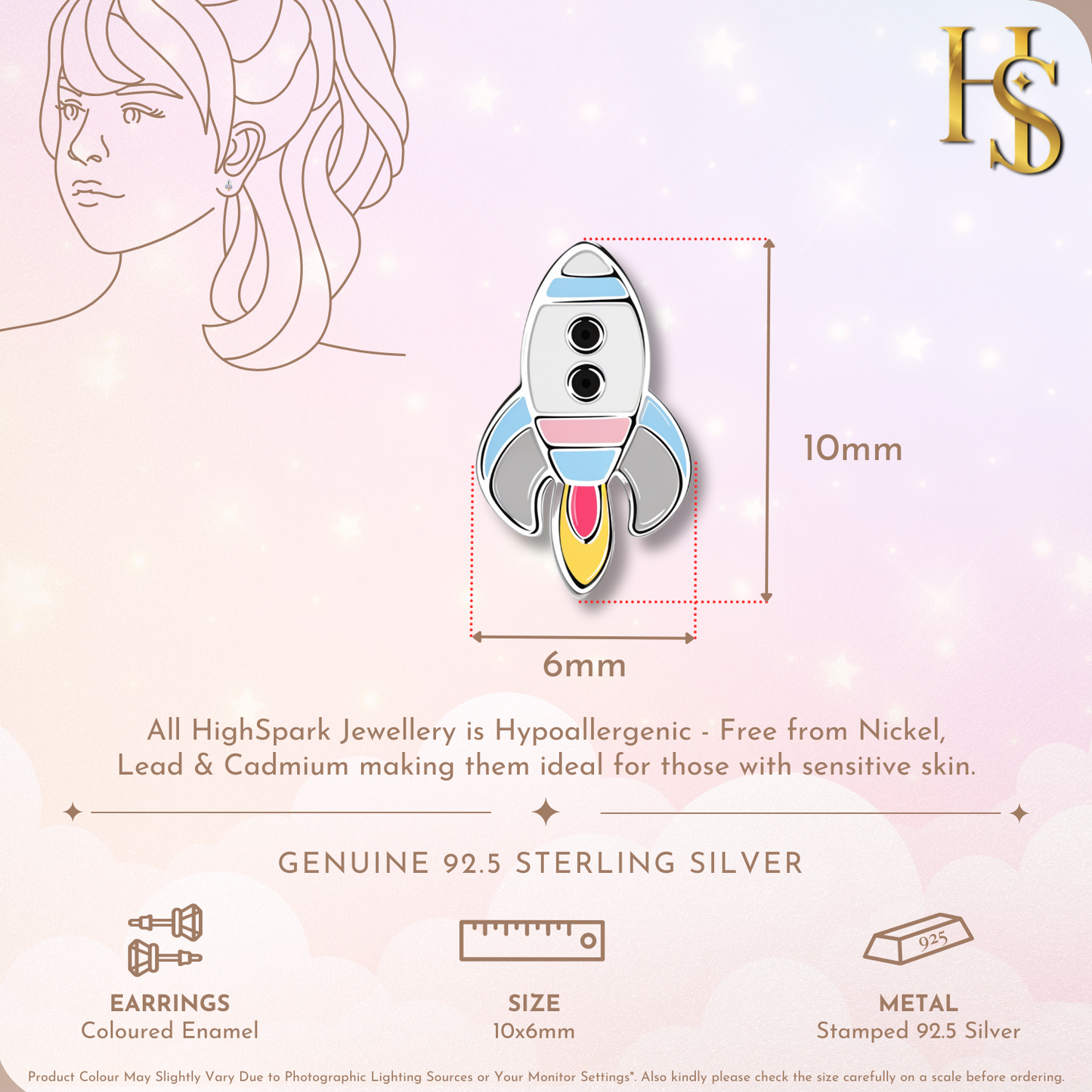 Cosmic Rocket Cute Enamel Stud Earrings in 925 Sterling Silver