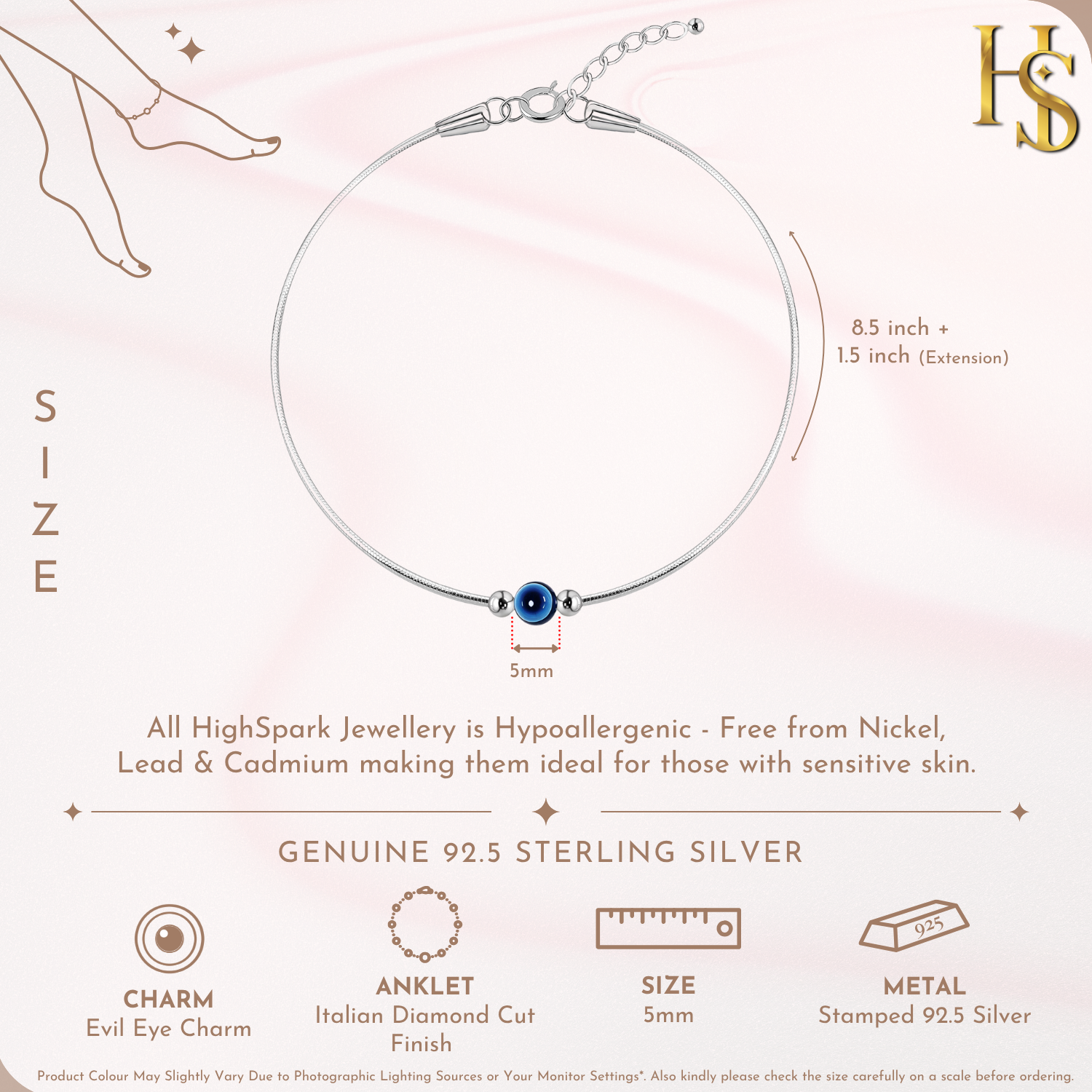 Evil Eye Protection Snake Chain Anklet in 925 Sterling Silver For Women
