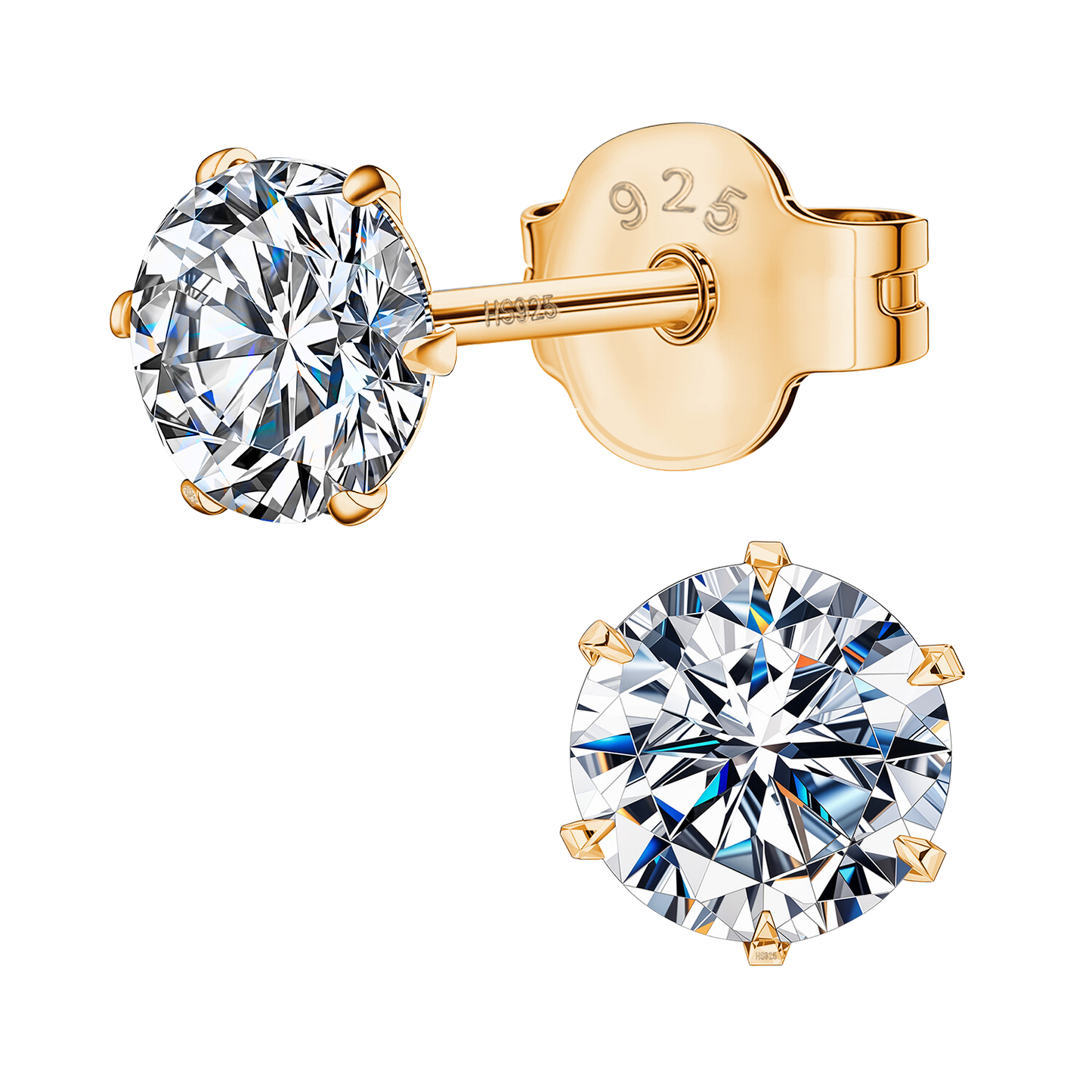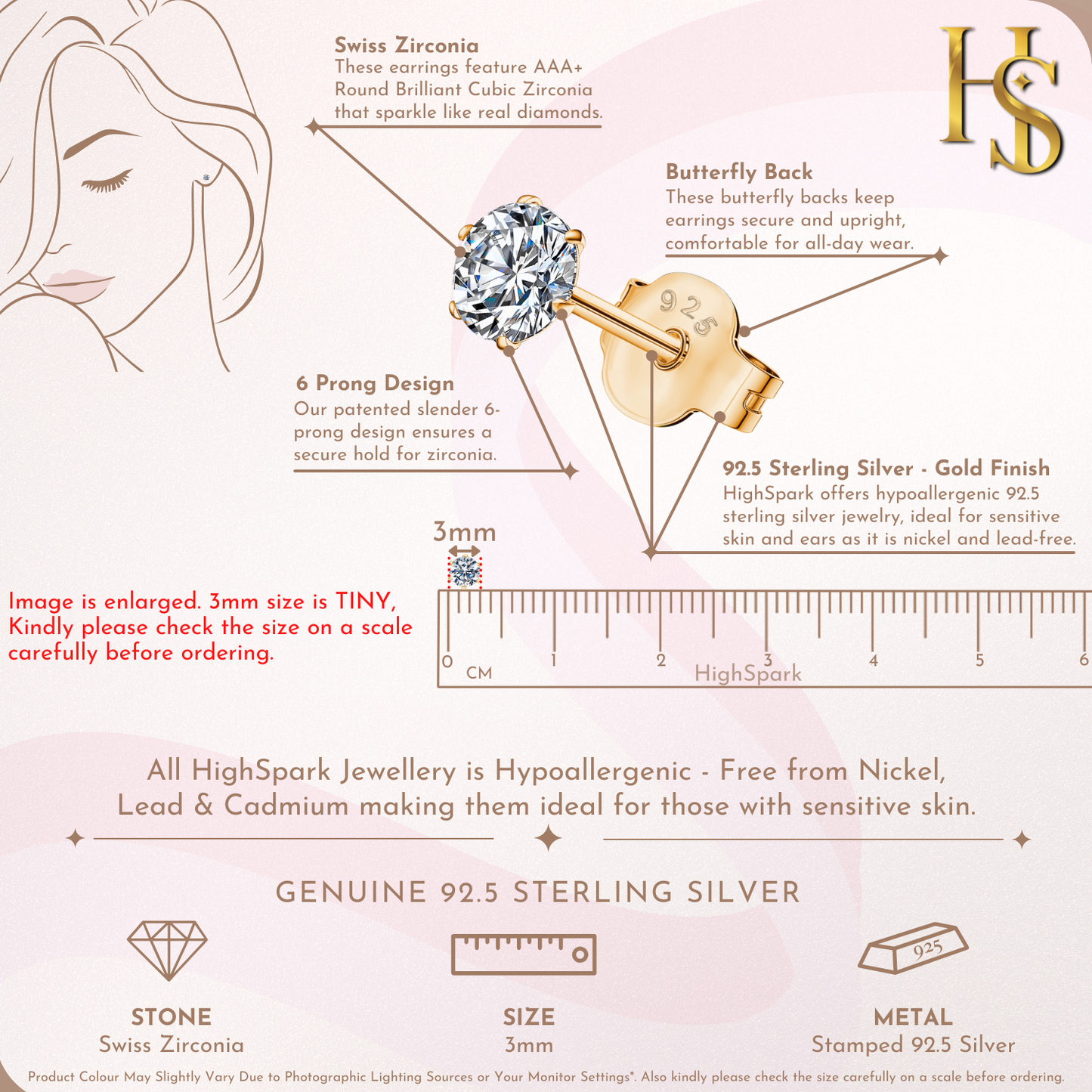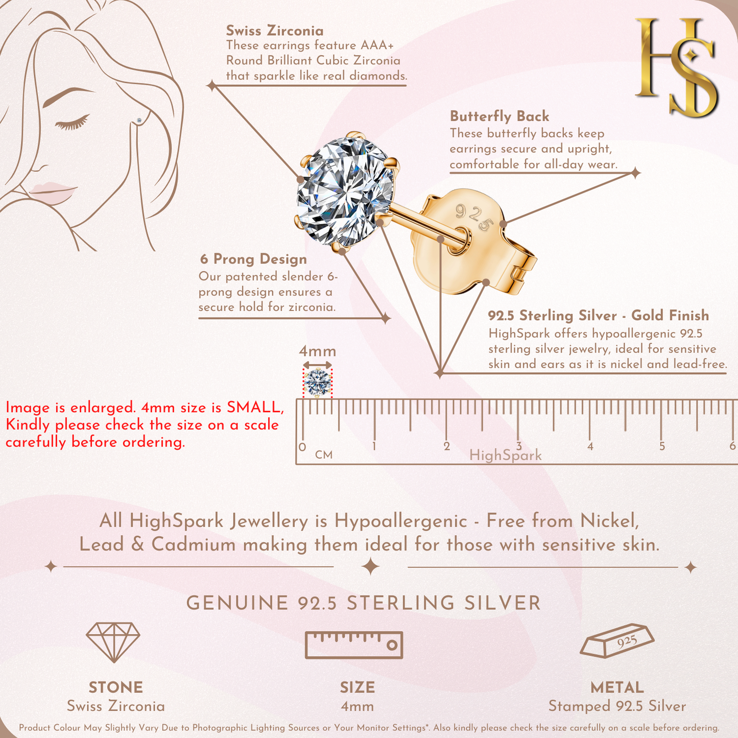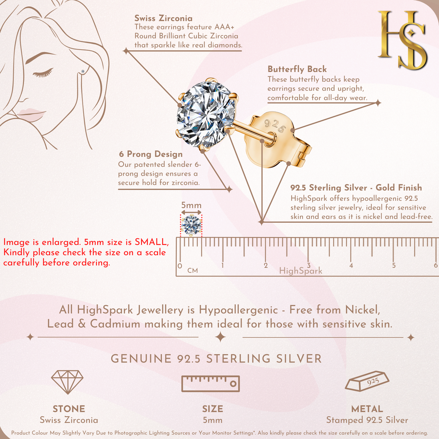 Gold Simple Solitaire Stud Earrings - 92.5 Silver - Round Brilliant Zirconia Tops for everyday wear in 18K Gold Finish