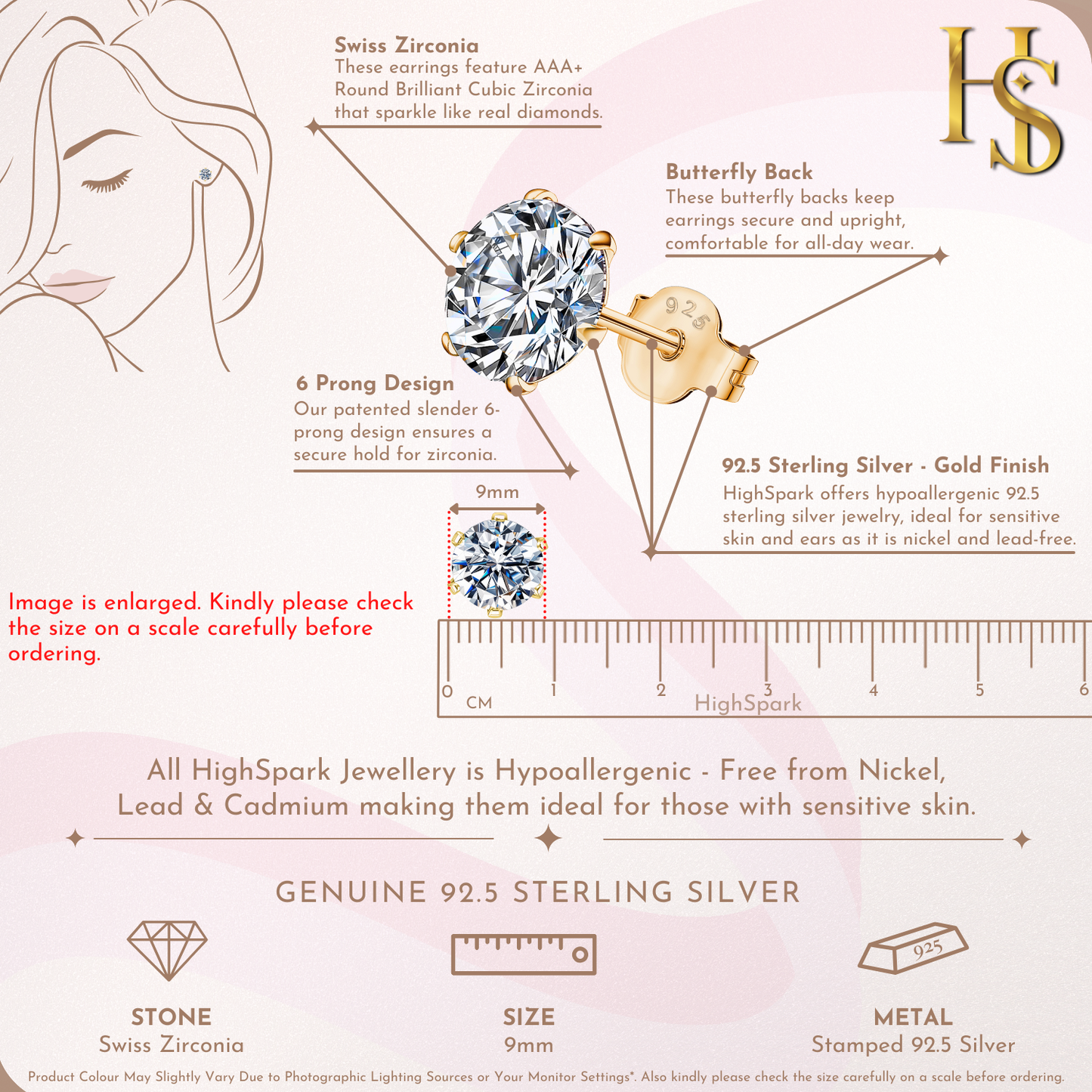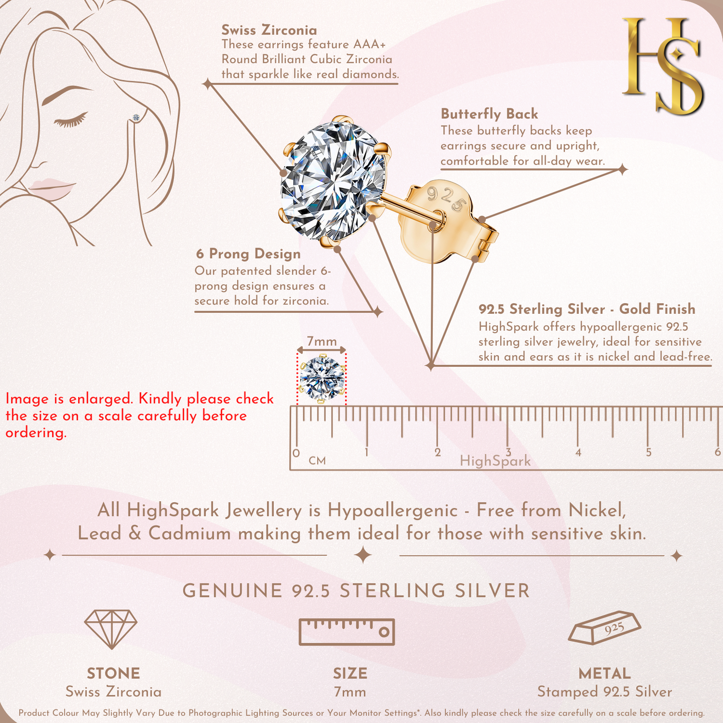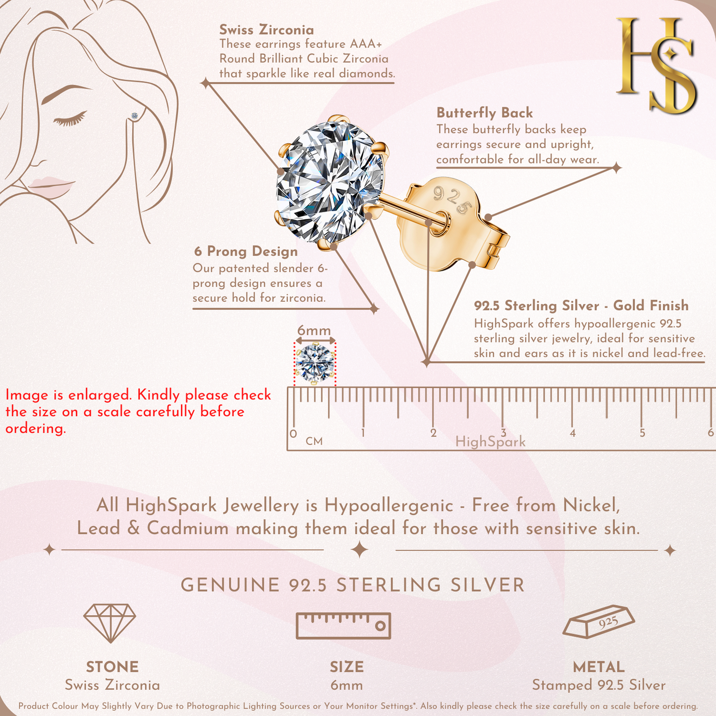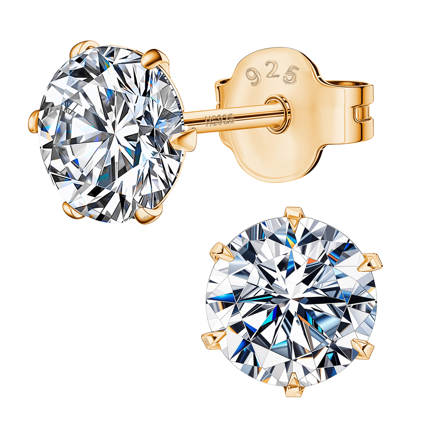Gold Simple Solitaire Stud Earrings - 92.5 Silver - Round Brilliant Zirconia Tops for everyday wear in 18K Gold Finish