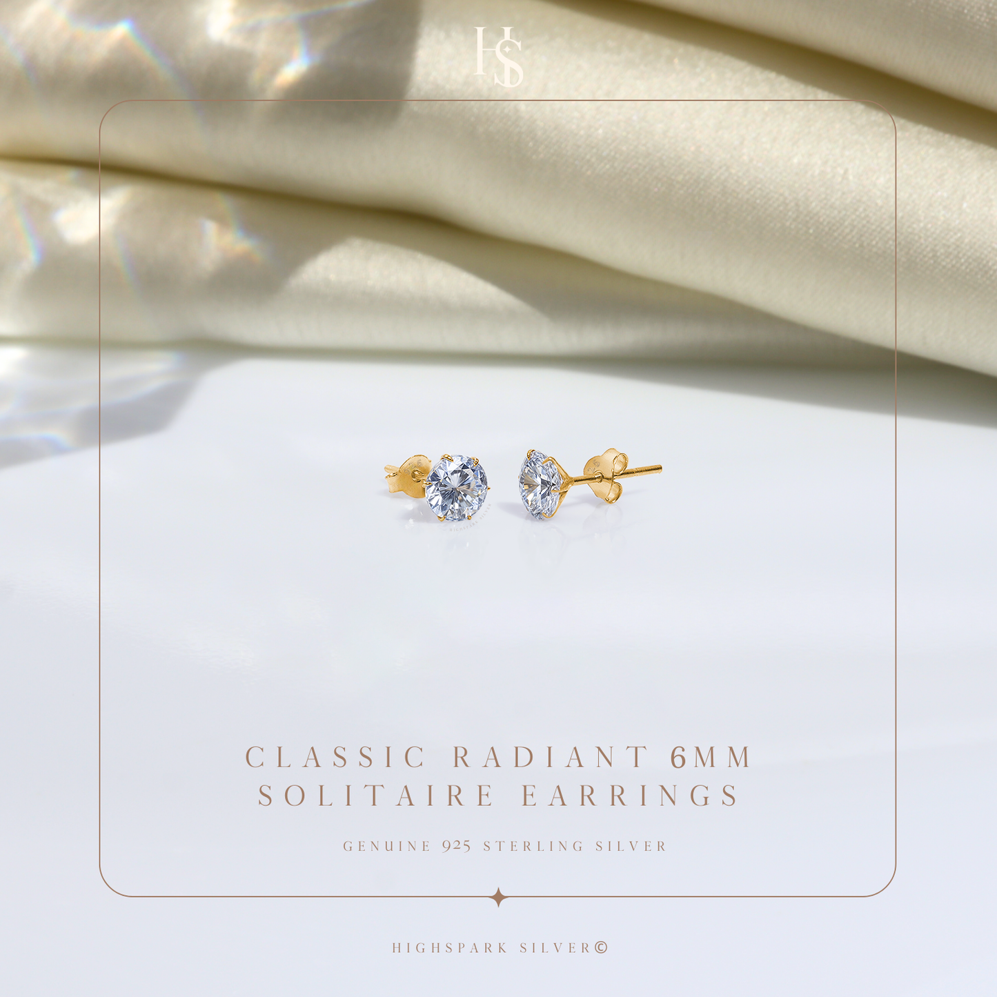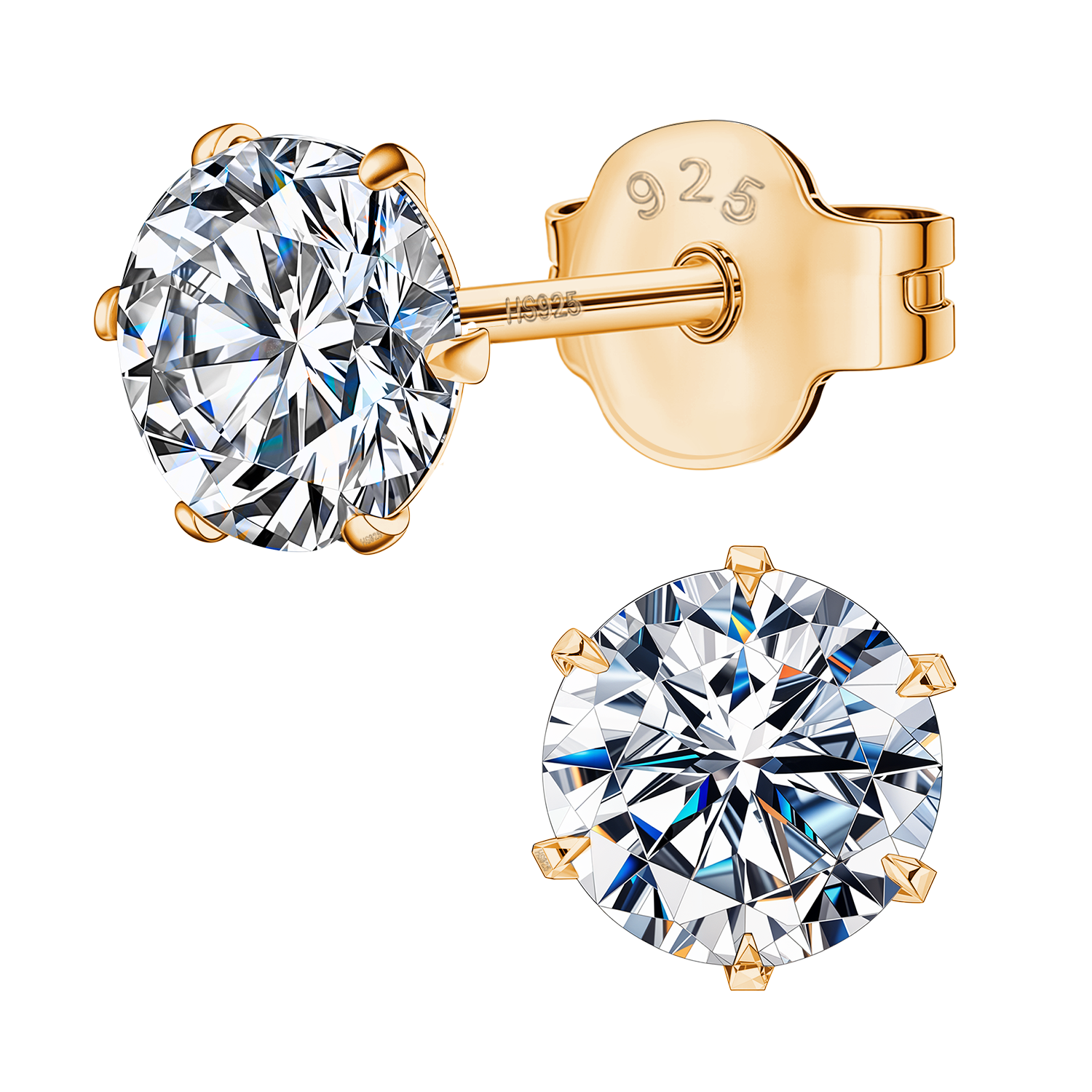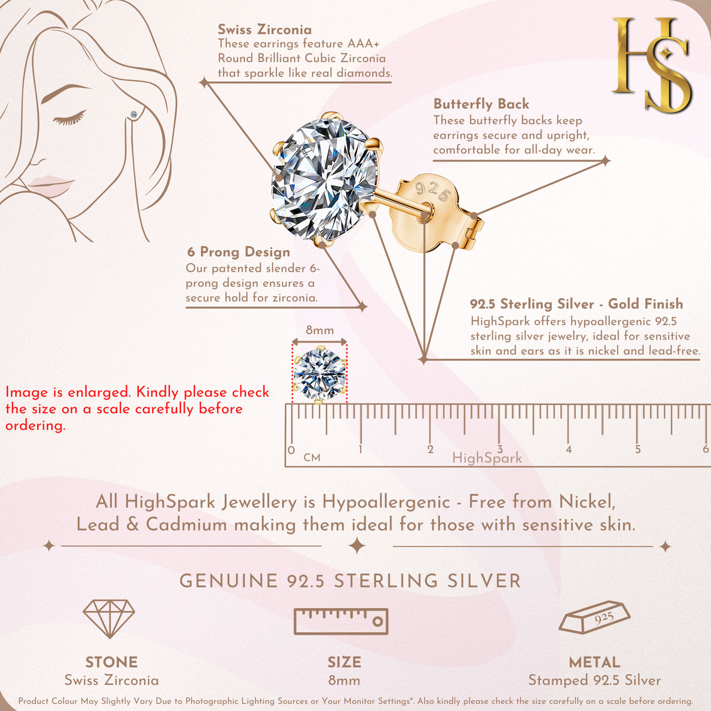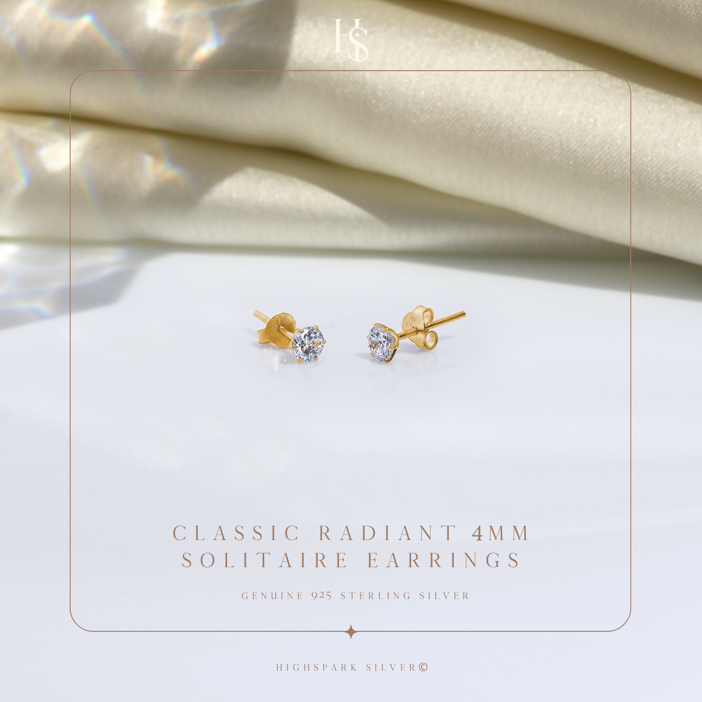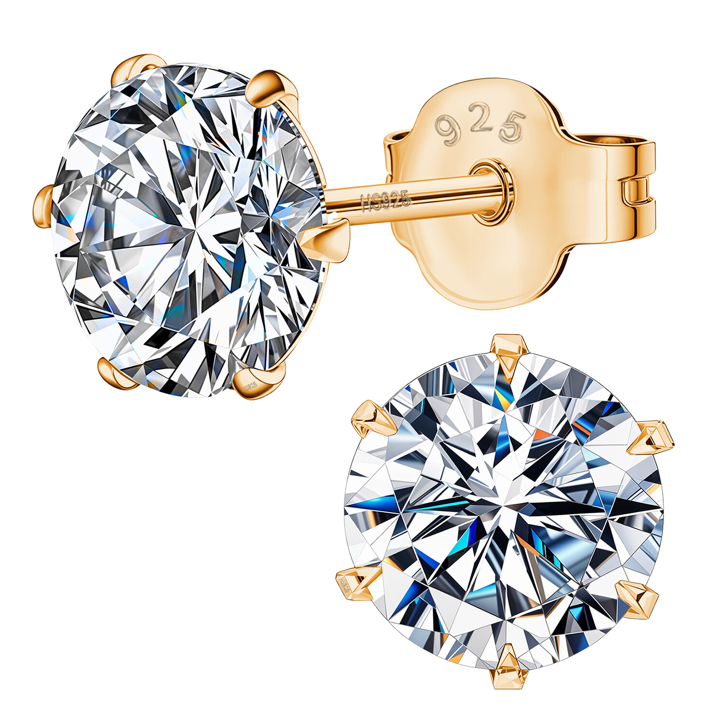 Gold Simple Solitaire Stud Earrings - 92.5 Silver - Round Brilliant Zirconia Tops for everyday wear in 18K Gold Finish