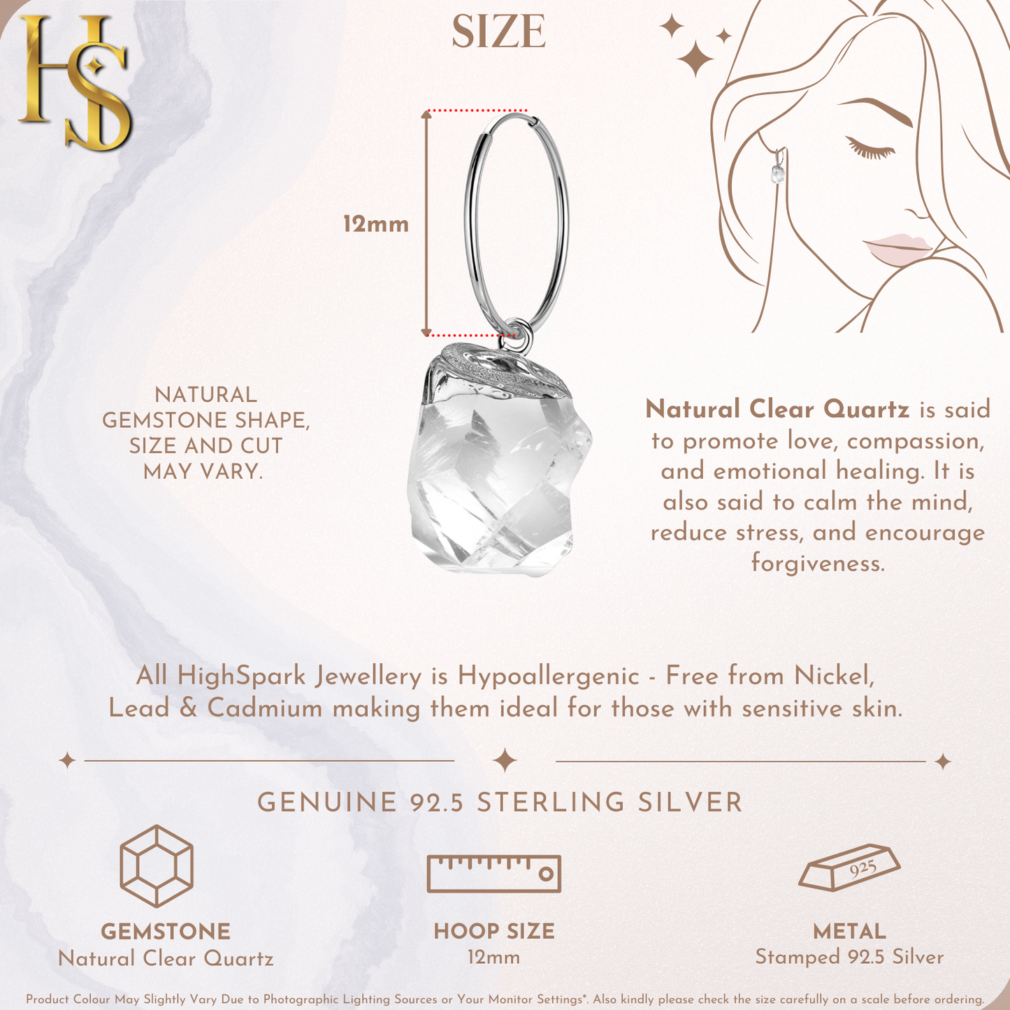 Natural Raw Gemstone Clear Quartz Rough Cut Hoop Earrings in 92.5 Sterling Silver
