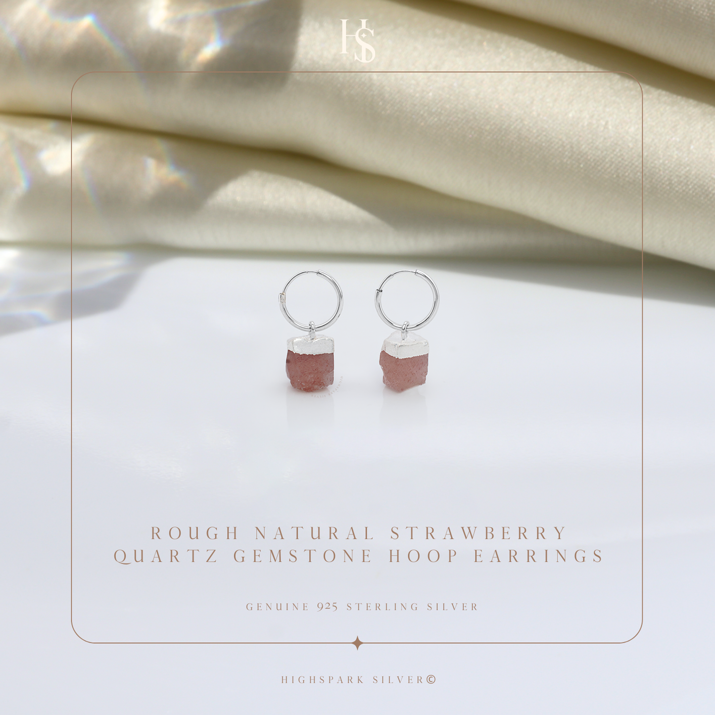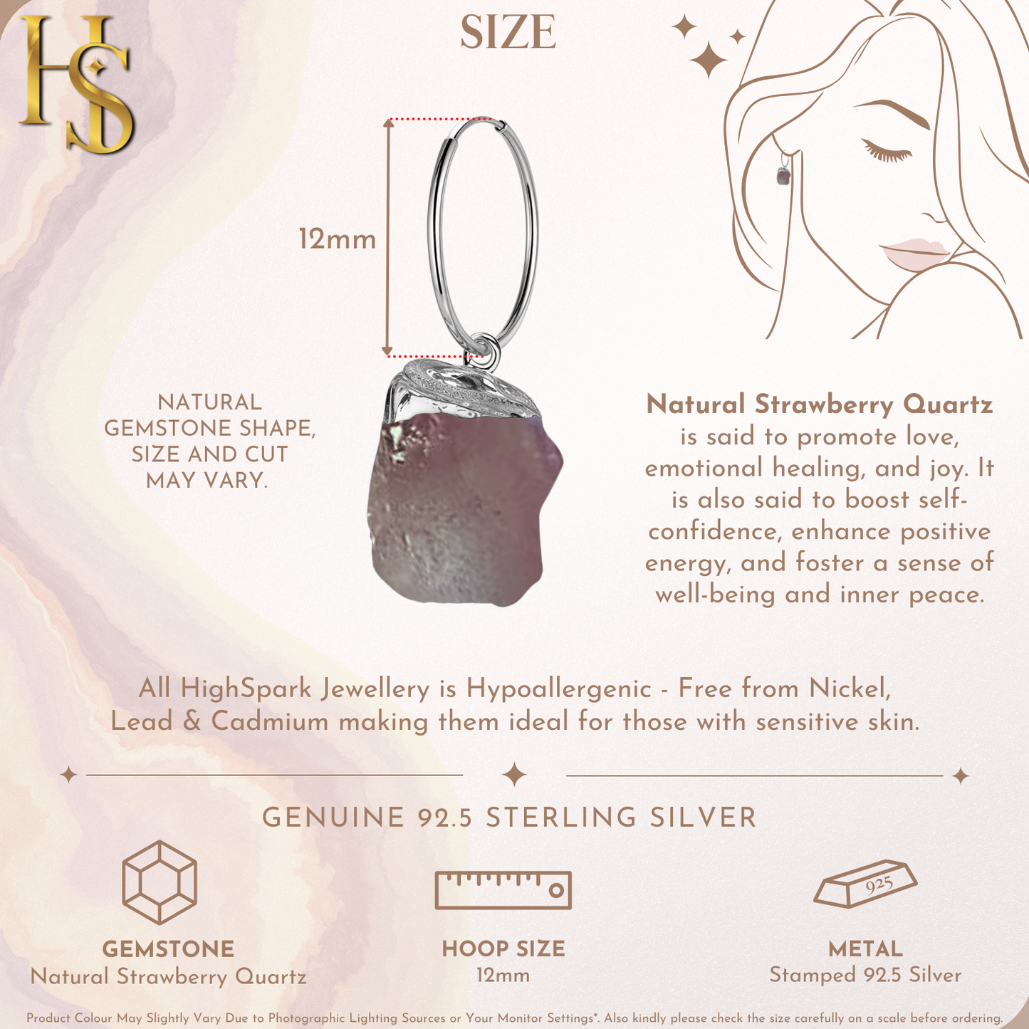 Natural Raw Gemstone Strawberry Quartz Rough Cut Hoop Earrings in 92.5 Sterling Silver