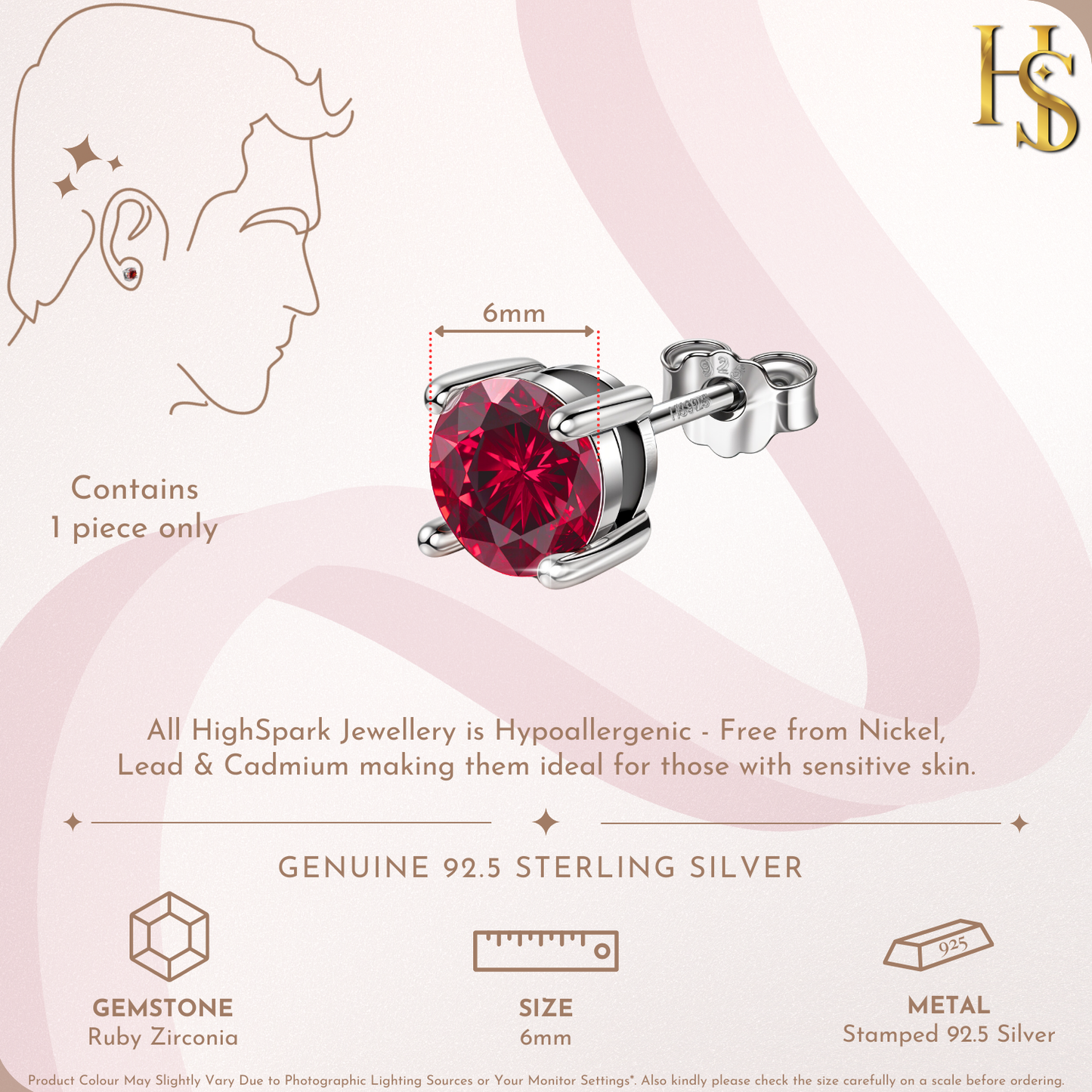 Men's Solitaire Stud Earring - 925 Silver - Birthstone July Ruby Zirconia - 1 Piece